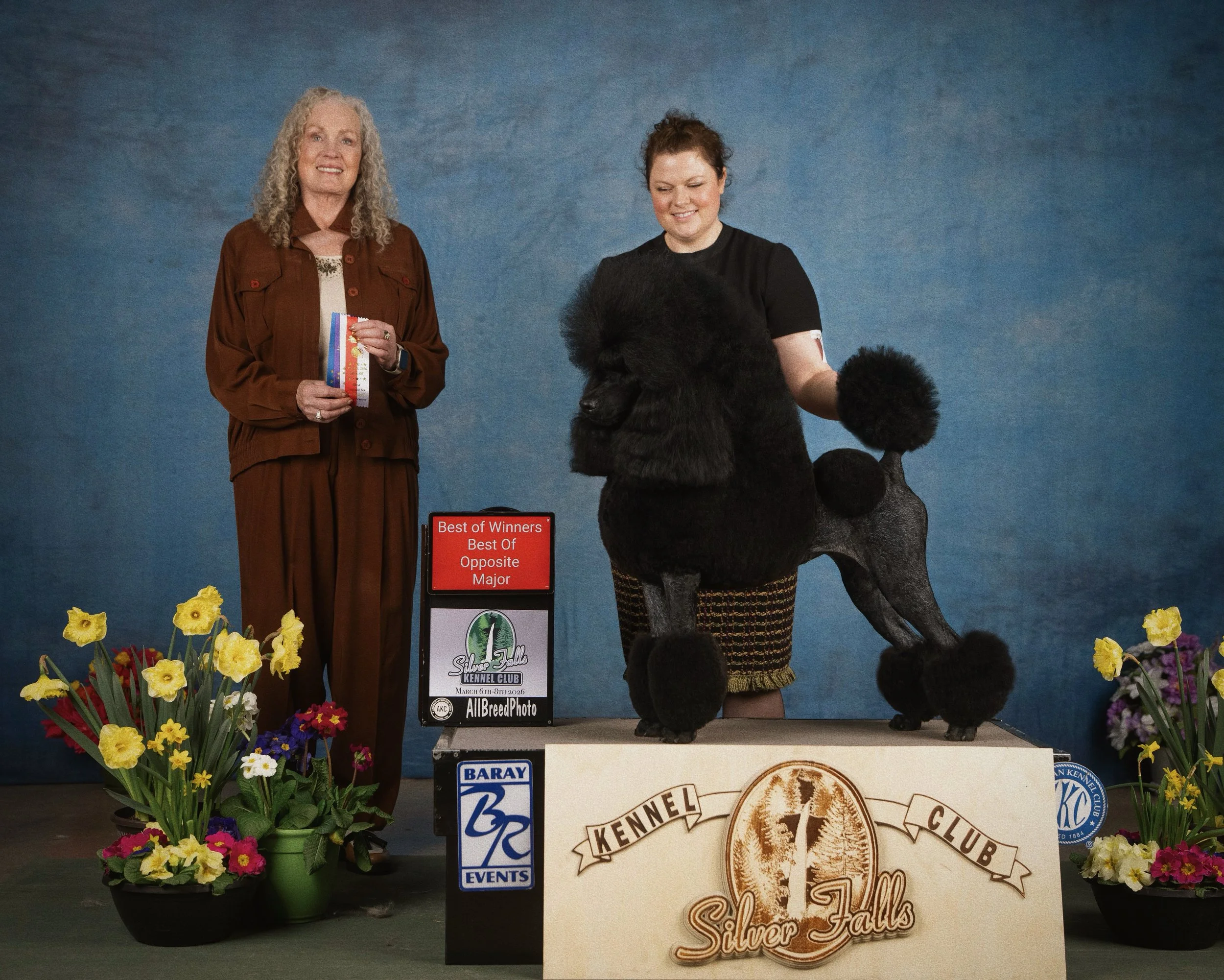 Dulcie is our lovely international girl. Her dam was bred by Aviator Standard Poodles in Canada, owned by Marina Garcia Roig of Magaro Standard Poodles in Spain, and is a littermate to the 2024 PCA National Specialty Variety Winner. Her sire comes from top-winning European and Scandinavian lines and is a son to the impressive “Mr. Big” MBIS Multi CH Da Maya Huffish Trademark. She is lively, wicked-smart, and affectionate.